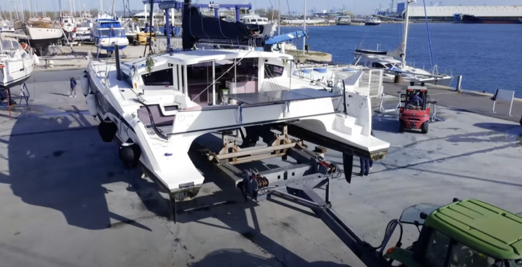Depuis plusieurs années, Port Navy Service s’est spécialisé dans la manutention et le stationnement des multicoques. Une rampe pour catamarans et trimarans de 13 m de large permet aux bateaux d’être sortis et mis à l’eau. Le port est également équipé de 2 remorques spécialement conçues pour leur manutention : une pour les bateaux allant jusqu’à 25 tonnes, et une autres jusqu’à 15 tonnes. D’ici quelques mois, le port sera également équipé d’une remorque 50 tonnes.